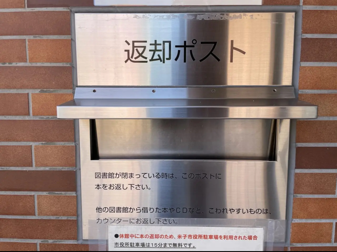 返却する本は、図書館玄関横の返却ポストにて返却できます。(他の図書館から借りた本、CD等、壊れやすいものは入れることができません。)