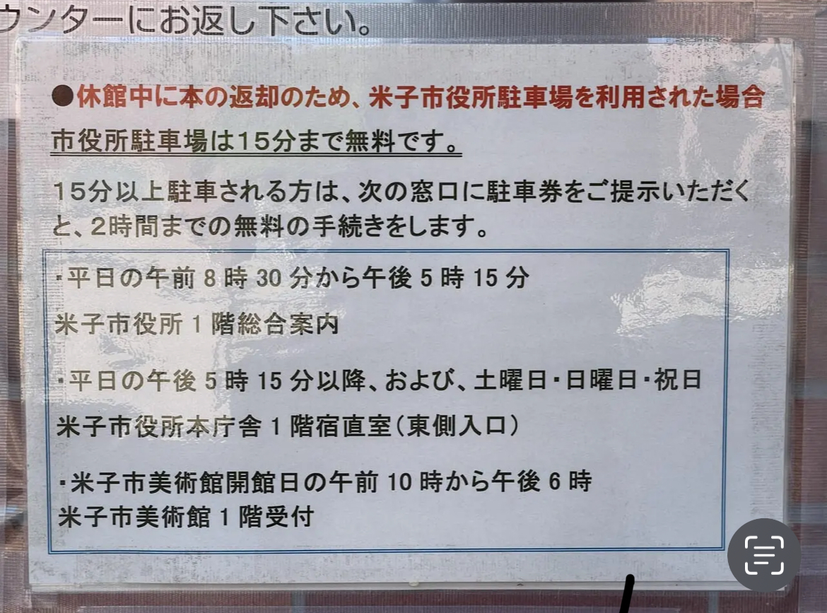 【休館中に本の返却のため、米子市役所有料駐車場を利用した場合】15分まで手続きなしで無料。15分を過ぎた場合は、次の窓口に駐車券を持って行くと2時間無料になります。