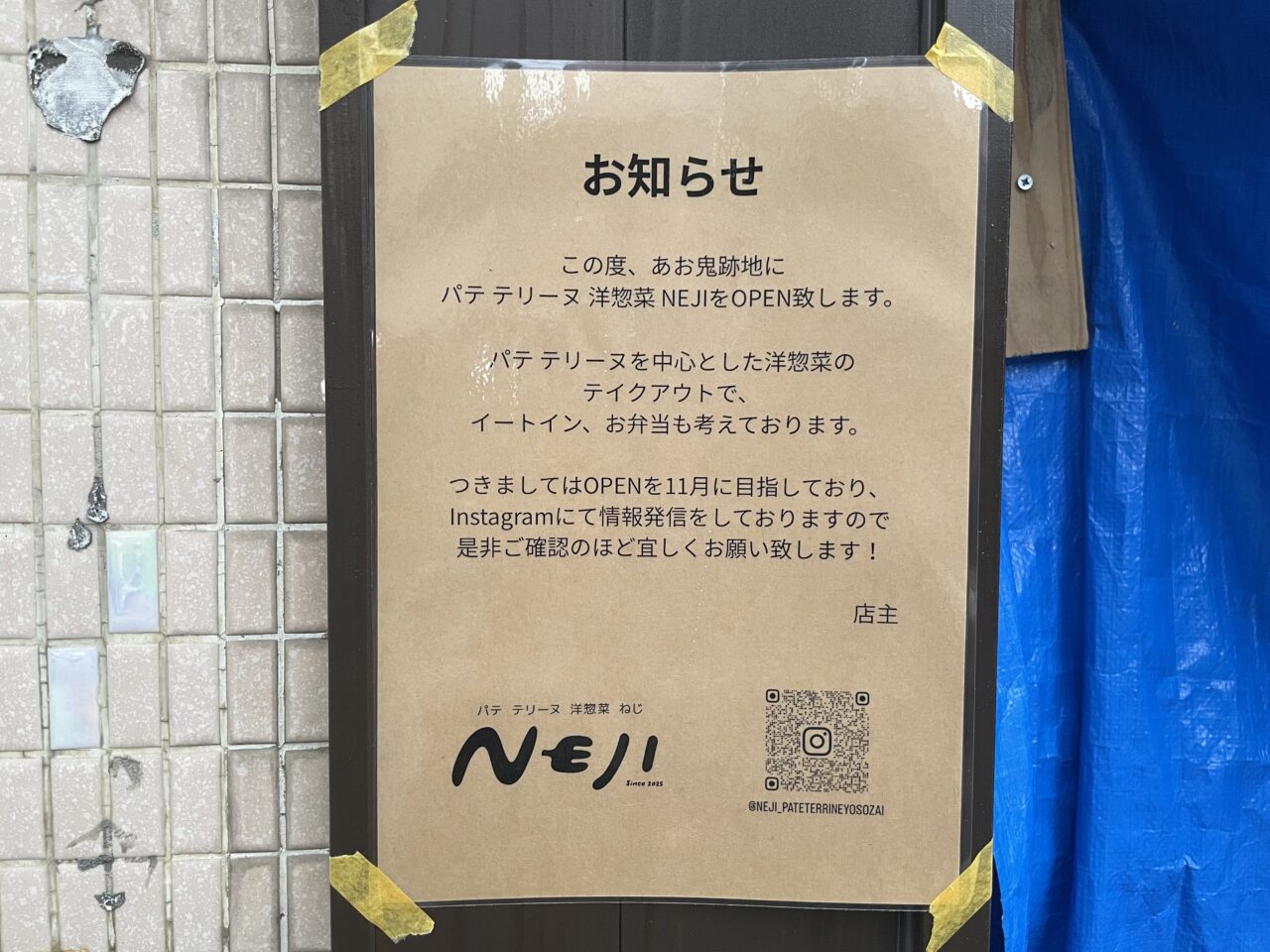 この度、あお鬼跡地に パテ テリーヌ 洋惣菜 NEJIをOPEN致します。