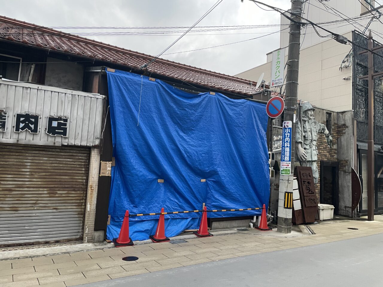 米子市角盤町の朝日町通りにある、居酒屋「あお鬼」跡地にブルーシートが掛けられていました。