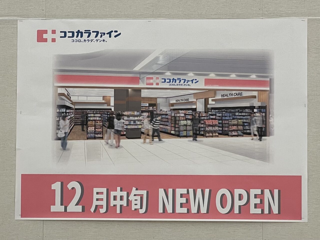 こちらはイルソイルソの閉店後は白いボードで覆われていましたが、現在はココカラファインのオープン告知が貼り出されています。