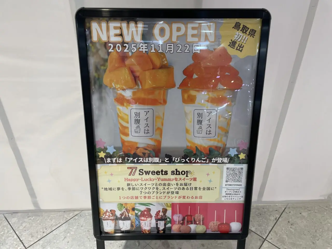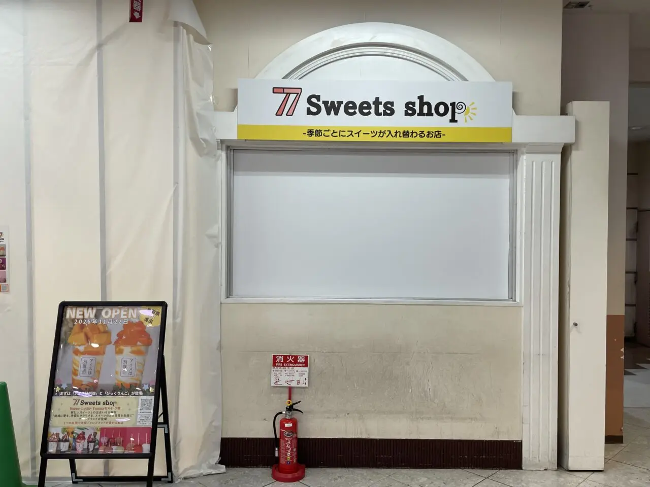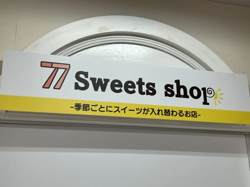 新店舗「77スイーツショップ(セブンセブンスイーツショップ)」の告知が掲示されていました。「2025年11月22日 NEW OPEN」と書かれています。
