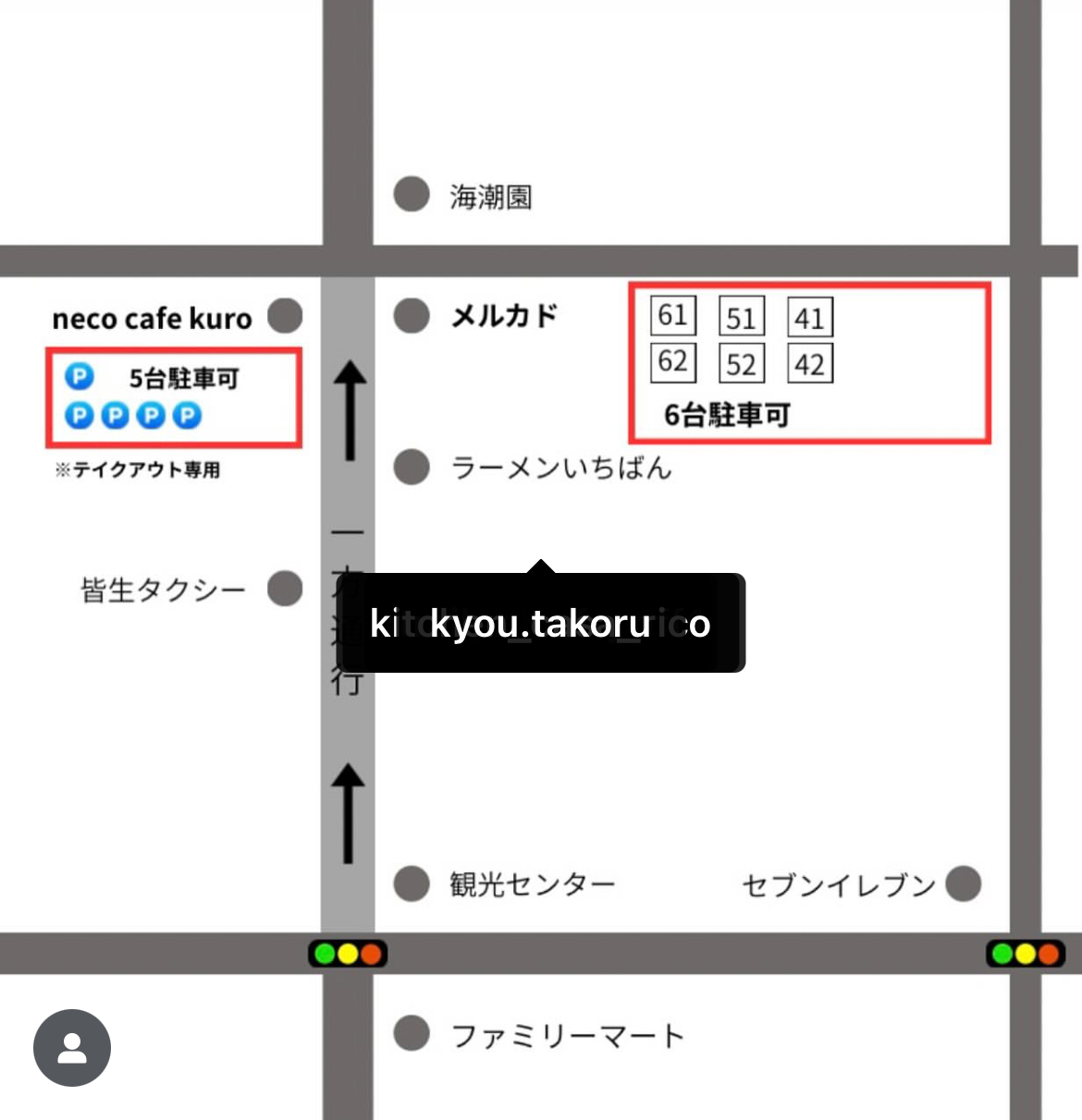 メルカド皆生駐車場はこちら。 neco cafe kuro横の駐車場(青いPマーク)はテイクアウト専用です。ゆっくりしたい方は 「番号付きスペース(41〜62)」が利用できます。