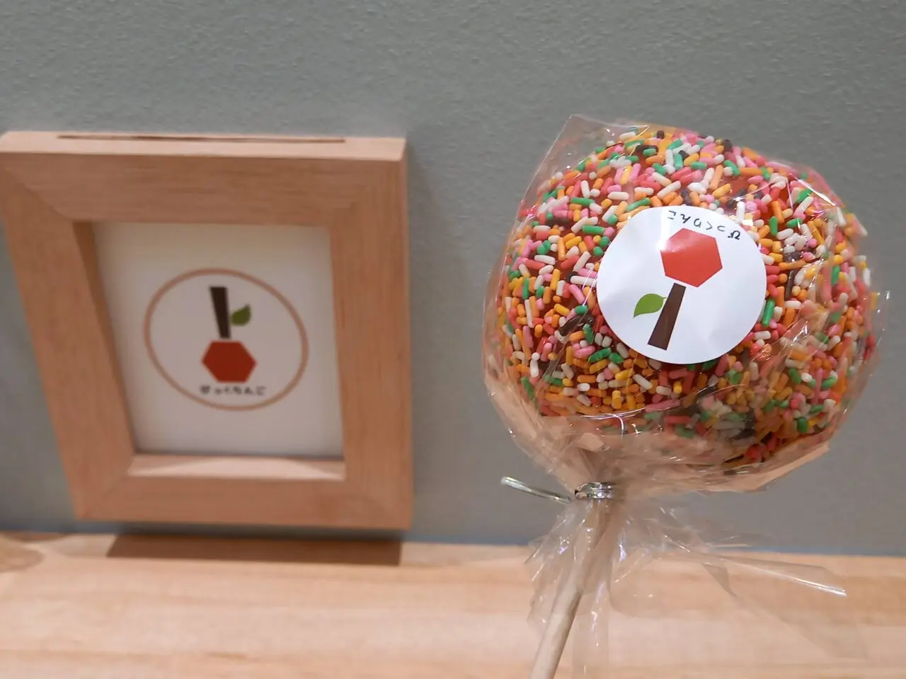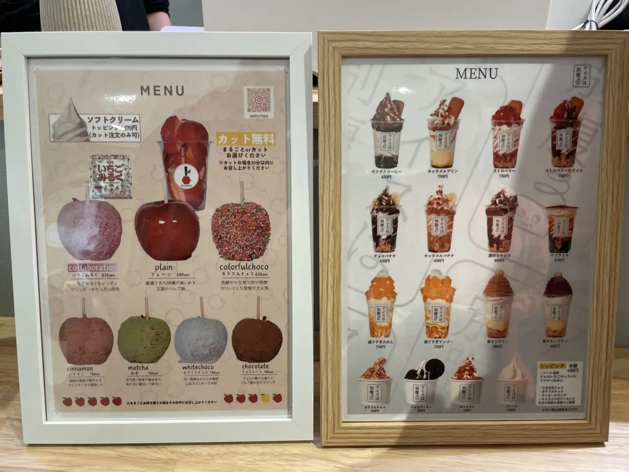 りんご飴は「まるごと」と「カット」から選べ、カットを選んだ場合は+270円でソフトクリームのトッピングも可能です。