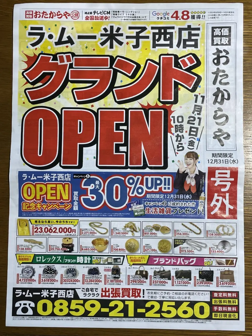 【米子市】11月21日(金)ラ・ムー米子西店に「おたからや」グランドオープン!買取強化キャンペーン【12月末迄】