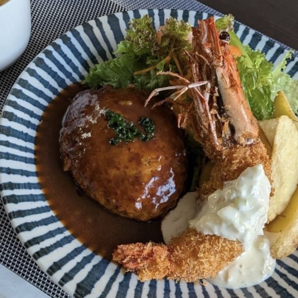 シェフのオススメは、何度も試作を重ねたハンバーグ!“肉肉しさ”と“柔らかい食感”にこだわったのだとか。選べる4種類のソースも手作りです。店長のオススメは大海老フライ。「大海老フライ&ハンバーグセット(1,800円・税込)」なら両方食べられる欲張りメニューです♪