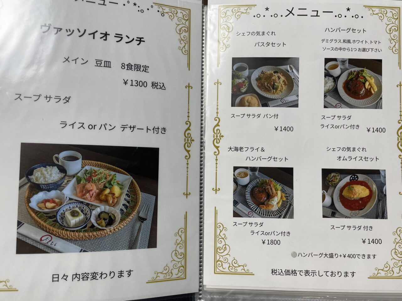 メニューはこちら。上のメニューは「ヴァッソイオランチ」以外、ランチ・ディナーどちらも注文できます。