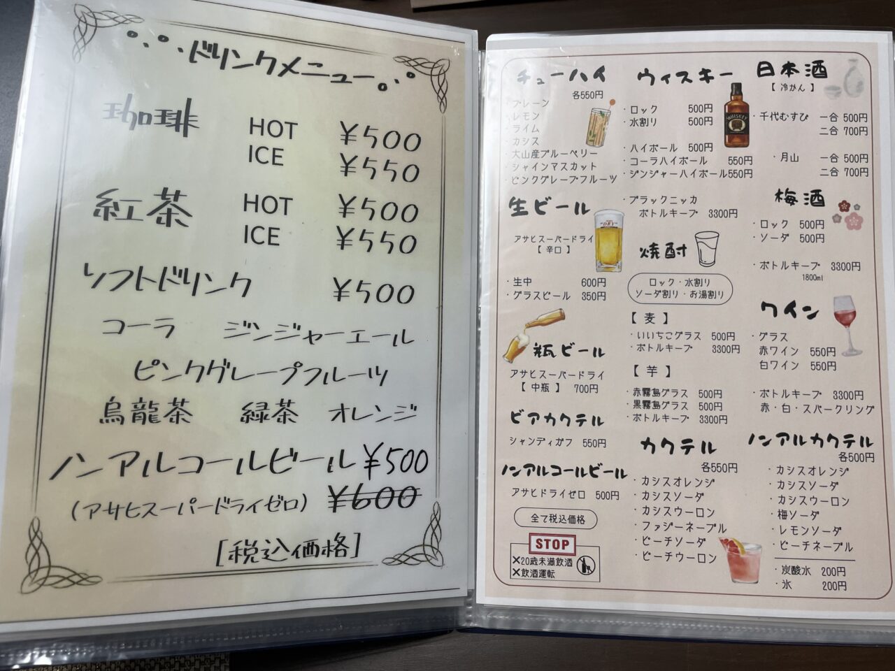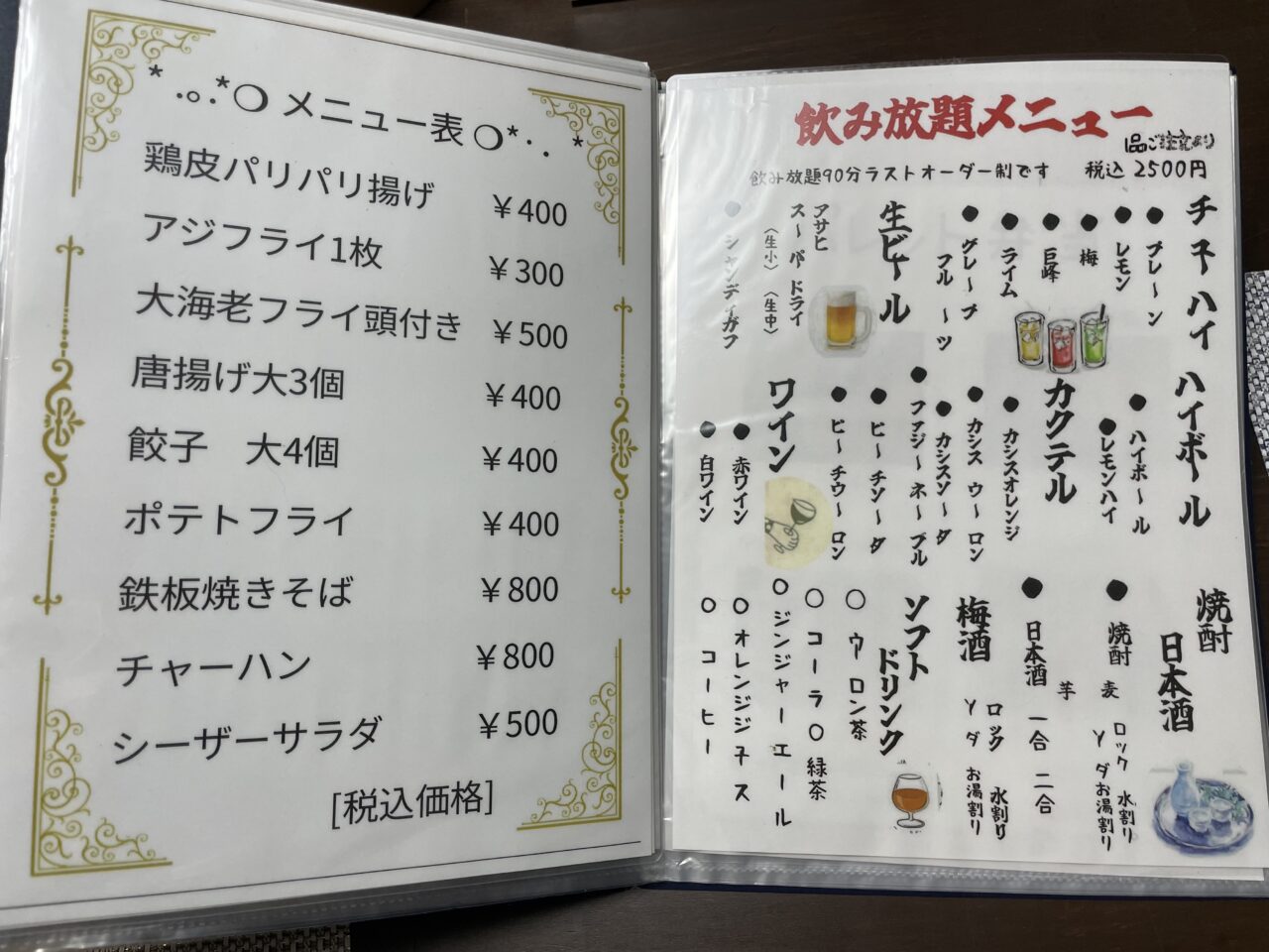 こちらはディナータイムのみのメニュー。夜は1品以上のオーダーで、右側の飲み放題が注文できます。