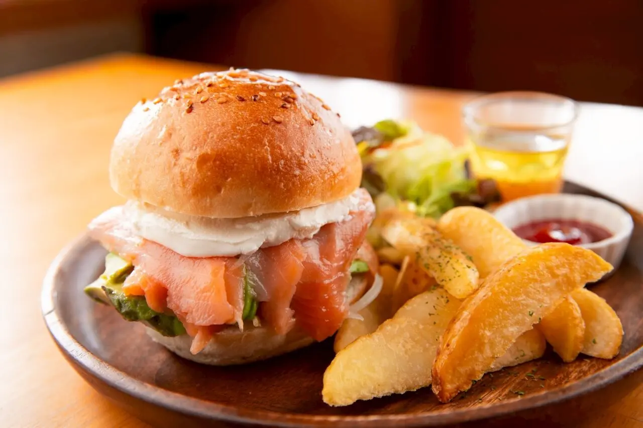 オススメの「hare バーガー」は、サーモンを太陽、クリームチーズを雲に見立て、晴れた日をイメージして作られたそう。アボカドも入って、間違いない組み合わせですね♪