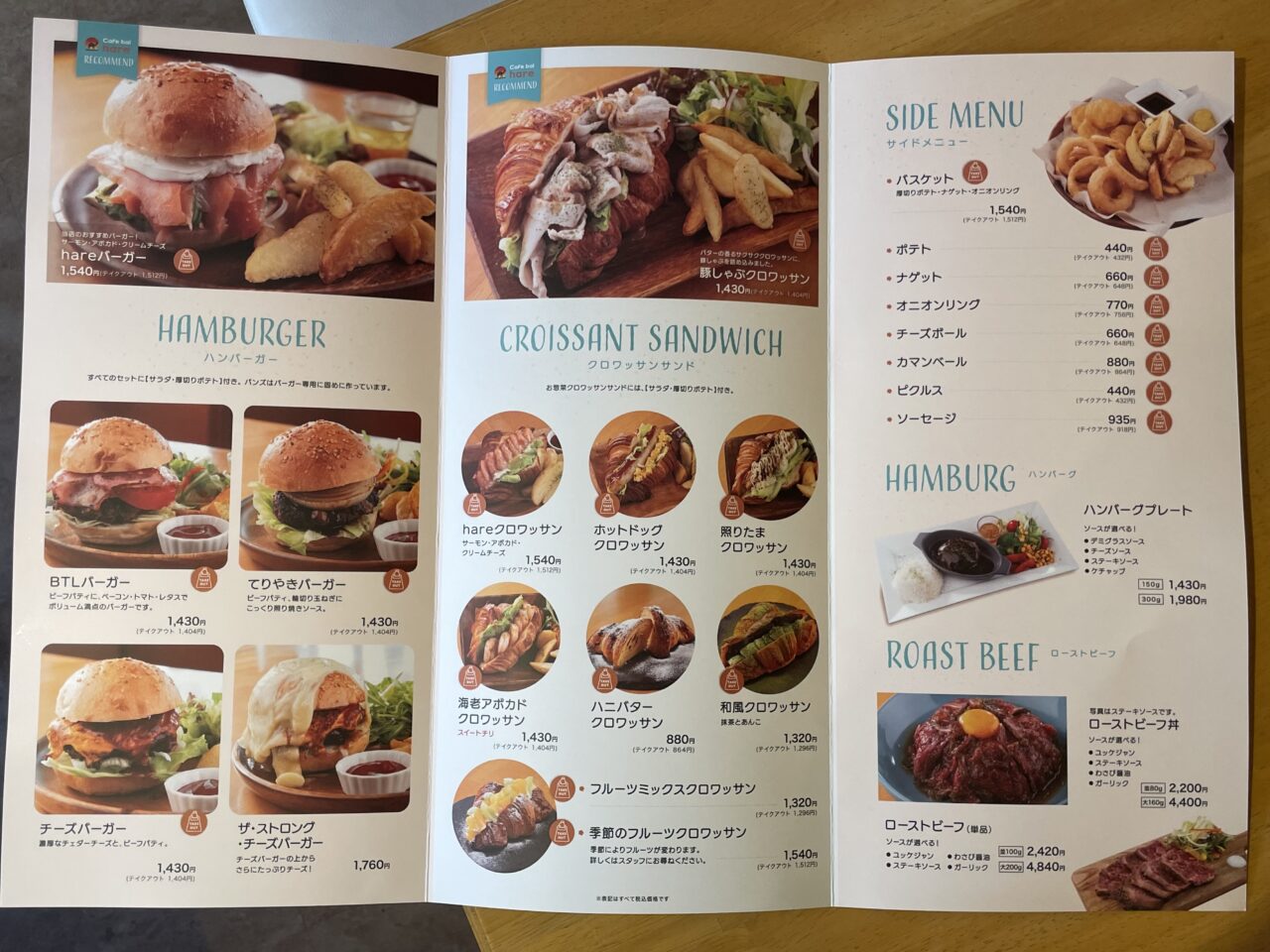 食事メニューはハンバーガーとクロワッサンサンドをメインに、ハンバーグプレートや、ローストビーフ丼などもあります。