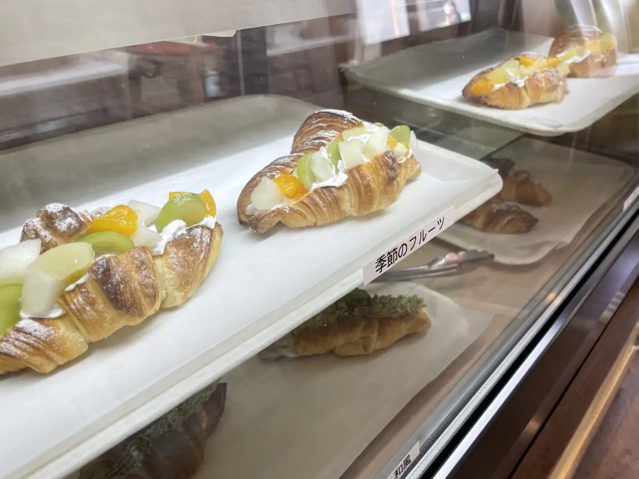 入口のショーケースには甘いクロワッサンサンドが並んでいました。メニューにテイクアウトと書かれているものは持ち帰りもできます。