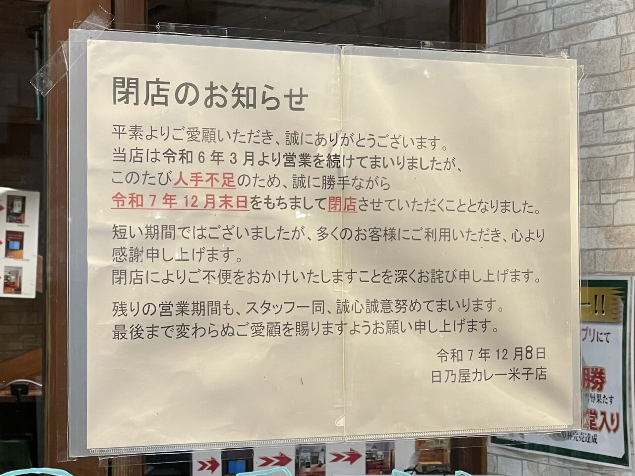当店は令和6年3月より営業を続けてまいりましたが、このたび人手不足のため、誠に勝手ながら令和7年12月末日をもちまして閉店させていただくこととなりました。