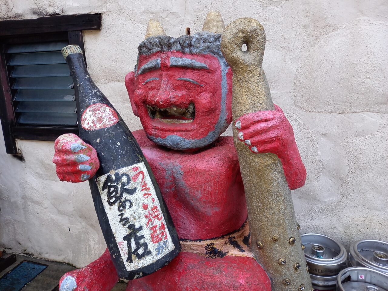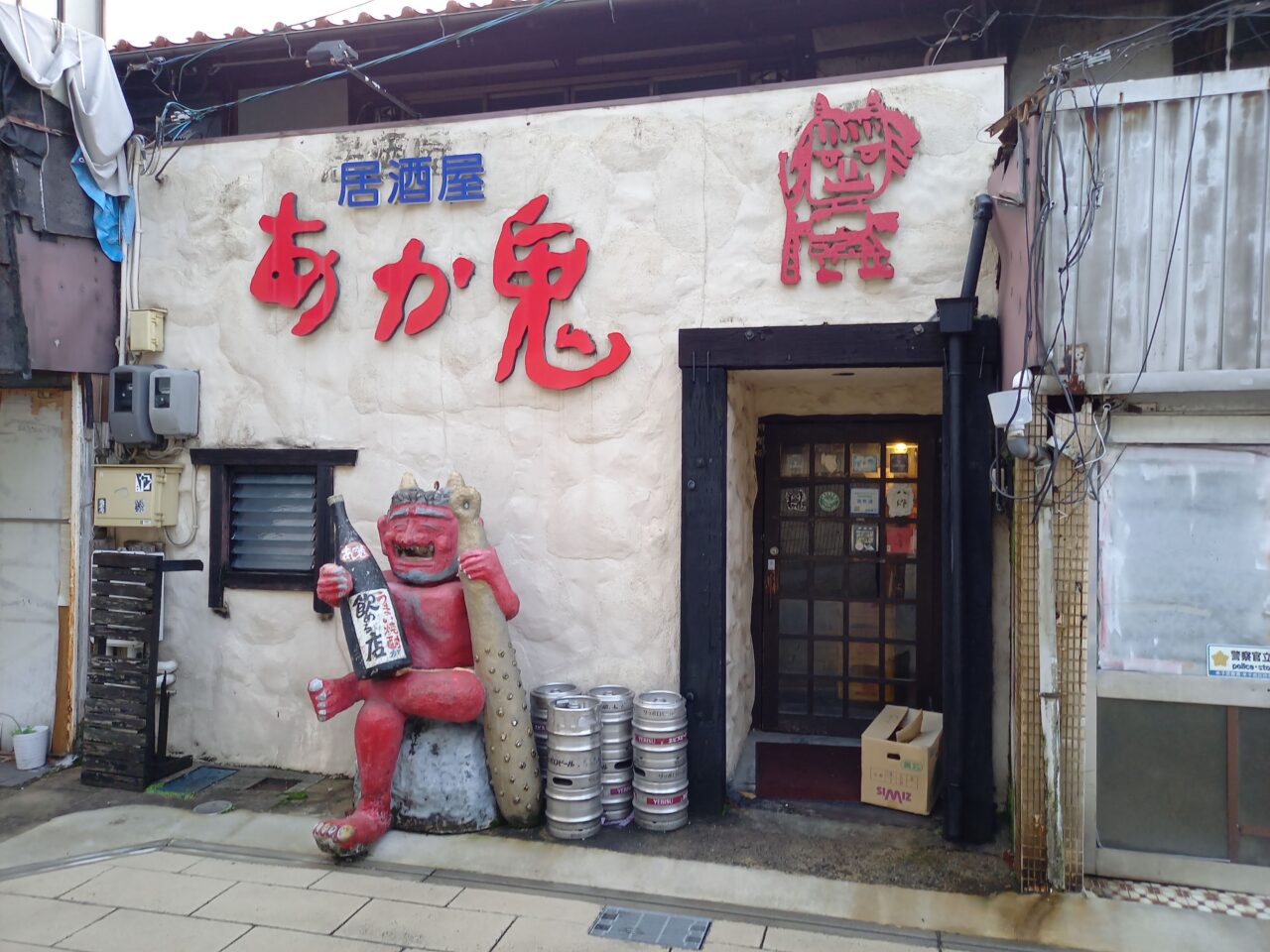 店前の焼酎を持って座っている鬼が印象的なあか鬼さん。朝日町の待ち合わせ場所としても定番ですよね。