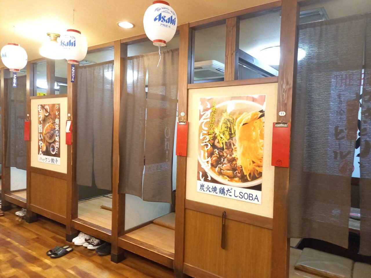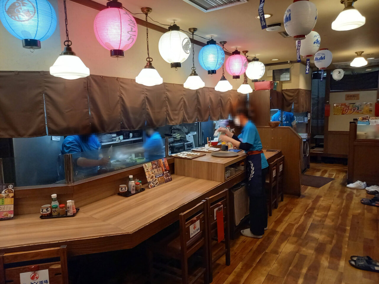 店内はカラフルな提灯が灯る、下町の居酒屋のような雰囲気です。カウンター席と掘りごたつ式の半個室部屋がありました。